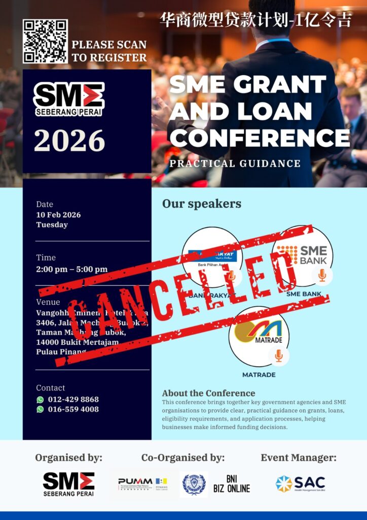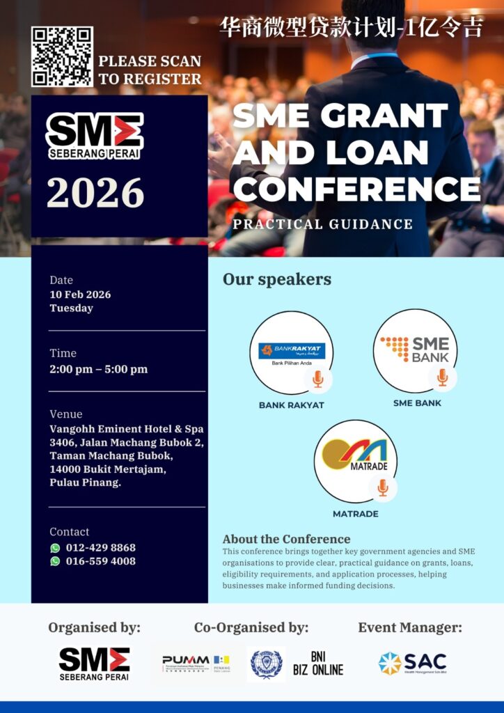 The SME Association of Seberang Perai, Penang is pleased to invite you to our upcoming “SME Grant and Loan Conference ” — a one-stop platform to learn about grants and loan opportunities designed to support SMEs.